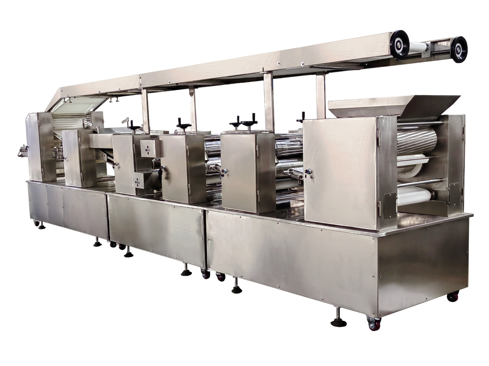 3、設備為變頻控制,每一道壓輥都采用單機驅(qū)動,通過測距傳感器,實現(xiàn)自動面帶張緊控制,多輥聯(lián)動??焖佥p松地制作大量面皮,提高生產(chǎn)效率。